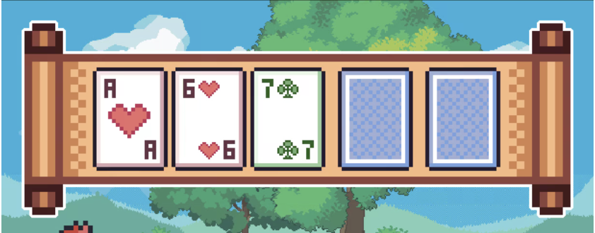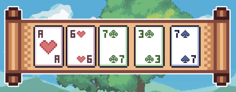 Below your character you'll see your two hole cards.  These two cards are your private cards that only you can use to make a hand.  The % shown to the left of the cards represents your odds of winning given the current information revealed by the board.