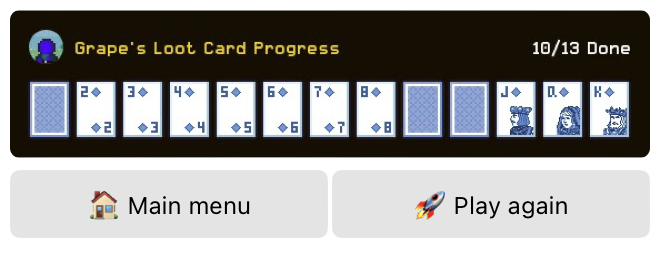 The goal is to collect all 13 cards.  Note that it is possible to get a duplicate loot card that you have previously received!   This is designed to be part of the challenge.  This makes it such that when you see characters with loot, you understand that it took real effort in achieving it.