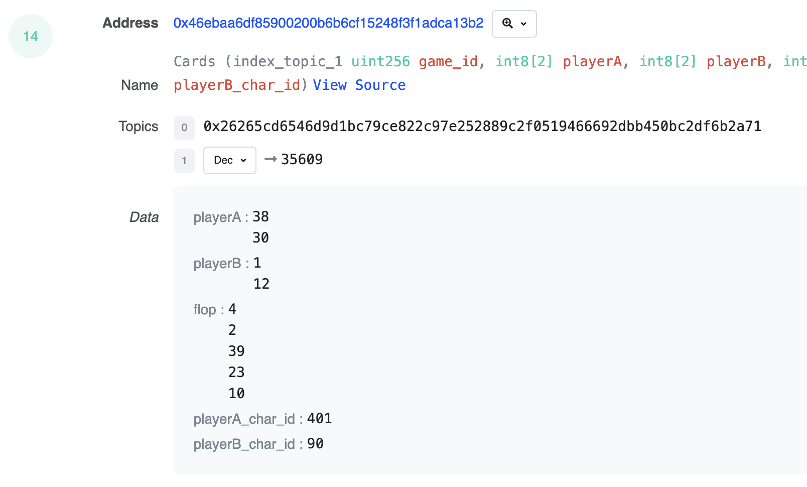`GameEnded` provides a summary of the outcome of the game.  The poker hand strength interpreter runs fully on-chain and can determine the best 5-card hand out of the 7 cards each player has available.  It also records the exact blockhash used to derive the cards allowing for an audit of the gameplay.
